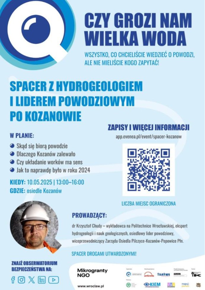 W odpowiedzi na te potrzeby, wiosną 2025 roku zrealizowano projekt edukacyjny „Przygotować się (nie tylko) na wielką wodę”, finansowany z miejskiego programu Mikrogranty, którego celem było podniesienie świadomości i odporności społecznej mieszkańców osiedla Kozanów. Inicjatywę zorganizowano wspólnie z Łukaszem Stępniem – specjalistą ds. komunikacji kryzysowej, jednym z kluczowych członków sztabu podczas powodzi 2024 roku, oraz Moniką Orlik, animatorką lokalnych działań społecznych.