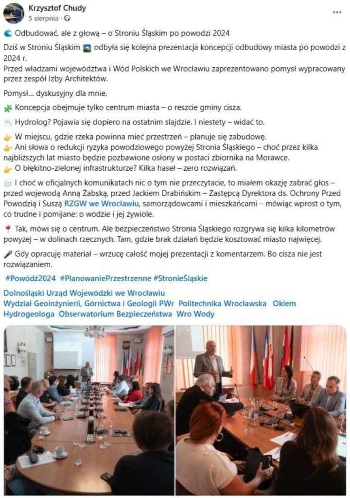 We wrześniu 2024 roku czas ten został zmarnowany – działania prewencyjne nie zostały uruchomione, a system formalny zareagował dopiero wtedy, gdy fala była już w drodze do Wrocławia. Współpraca z liderami rozpoczęła się dopiero po oddolnych inicjatywach i presji ze strony samych liderów powodziowych, którzy samodzielnie gromadzili dane, analizowali prognozy i przekazywali mieszkańcom informacje o możliwym rozwoju sytuacji.