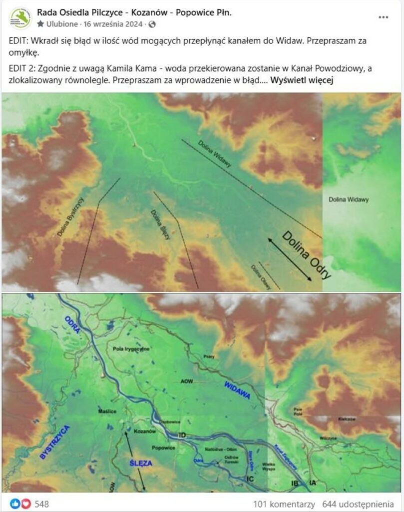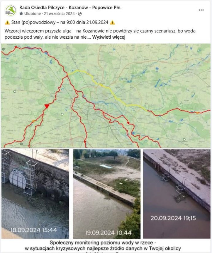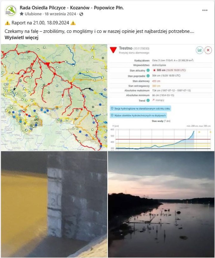 Na osiedlu Pilczyce–Kozanów–Popowice Północ podjęto wówczas decyzję o rozpoczęciu systemowych analiz w oparciu o własne zasoby wiedzy – dane hydrologiczne, obserwacje terenowe i prognozy IMGW. Jednocześnie już 14 września rozpoczęto codzienną komunikację z mieszkańcami poprzez profil Facebookowy Rady Osiedla, publikując aktualne informacje o stanie wód, prognozach oraz praktyczne wskazówki dotyczące przygotowań. Działania te miały charakter informacyjno-prewencyjny i były prowadzone w odpowiedzi na pilną potrzebę mieszkańców, którzy poszukiwali wiarygodnych źródeł informacji w sytuacji niepewności.